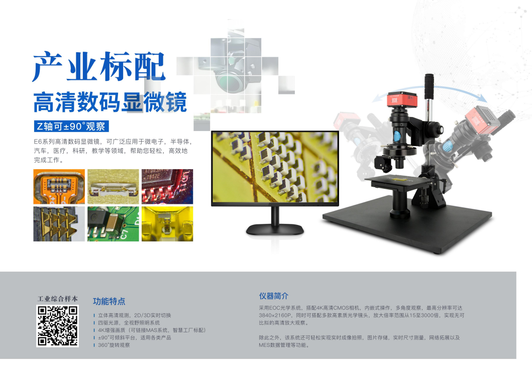 E6智能數(shù)碼顯微鏡是一款成像高清,色彩還原能力高,可改變視野角度的超級視頻顯微鏡。配置智能工業(yè)相機系統(tǒng),增強畫質(zhì),實時4K分辨率高清成像。讓外觀檢測更為簡單,輕松。配置EOC組合光學(xué)系統(tǒng),輕松實現(xiàn)全視角(0-180度水平傾斜觀察),可選配2D/3D光學(xué)系統(tǒng),適用于更多運用場景。