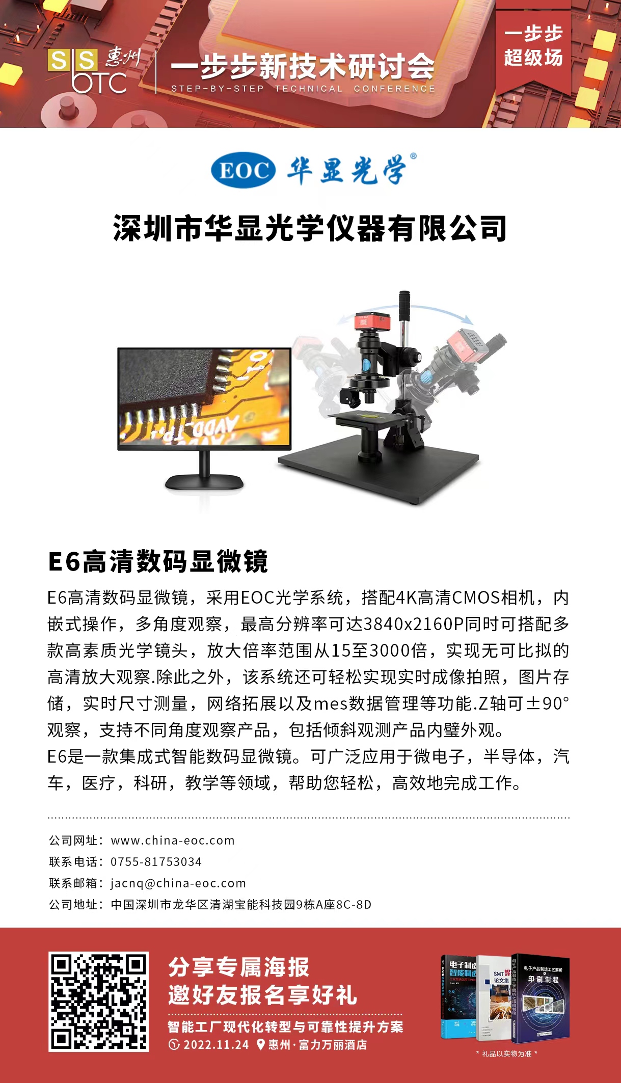 SbSTC-惠州站將于11月24在惠州富力萬麗酒店舉行,此次研討會主題《智能工廠現(xiàn)代化轉(zhuǎn)型與可靠性提升方案》,匯集SMT領(lǐng)域,為大家?guī)硪粓龈韶洕M滿的技術(shù)研討會。我司將攜帶SMT光學(xué)解決方案現(xiàn)場展示,誠意邀約您蒞臨現(xiàn)場指導(dǎo)。