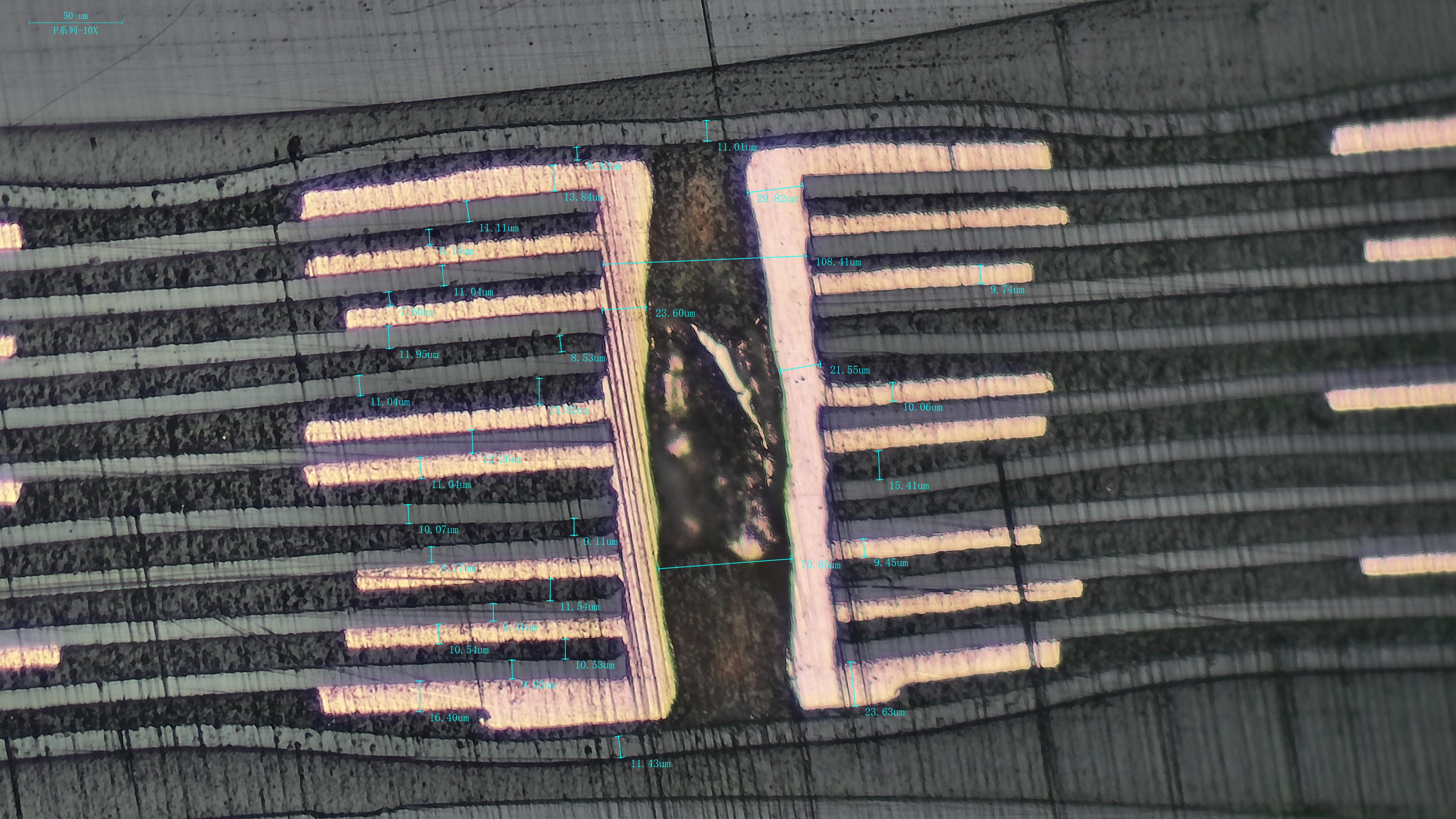 ● 線路寬窄公差(如設(shè)計(jì)值±5μm內(nèi)的控制能力)、銅箔厚度均勻性(通過圖像中不同區(qū)域的灰度差異輔助判斷)、油墨覆蓋焊盤的最小邊緣間距(需精確到1μm級(jí))等關(guān)鍵參數(shù),均依賴清晰圖像結(jié)合標(biāo)尺或顯微測(cè)微尺進(jìn)行測(cè)量。