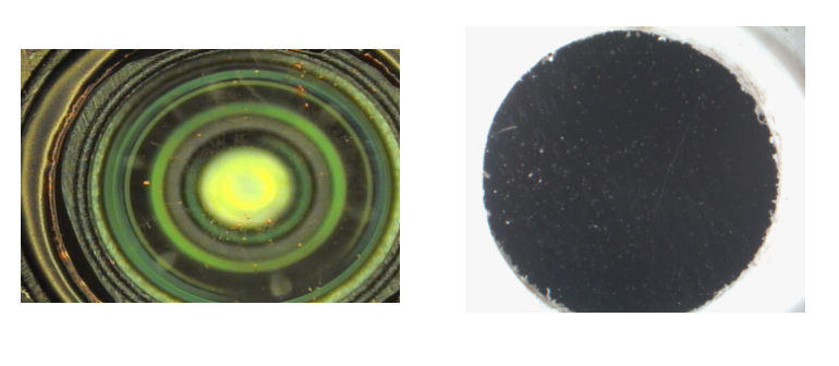 ● 模組LENS表面檢測(cè),因其是玻璃制品,表面易反光,其細(xì)小裂痕或異物都需要實(shí)時(shí)的觀察。我司采用平行光路照明系統(tǒng),與鏡頭觀察方向垂直照明到工件表面,形成反光照射;因其表面有鍍膜,所以觀察到是紅色(可通過菜單調(diào)節(jié)設(shè)置為白色),其表面紋路,印痕,臟點(diǎn)清晰可見。