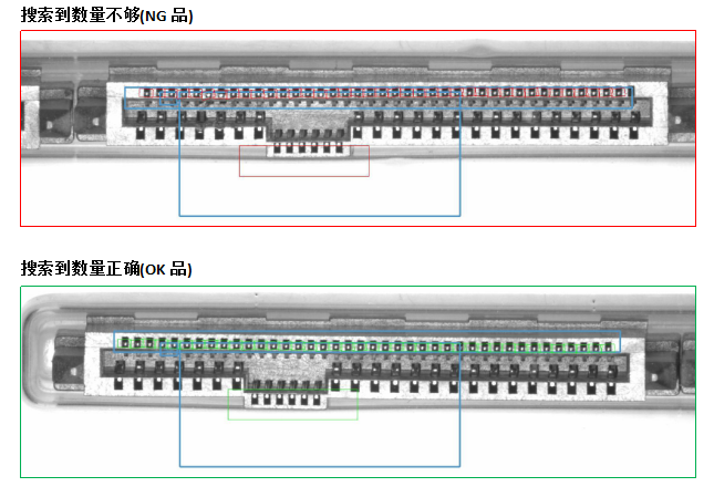 設定檢測范圍,在設定的范圍內(nèi)搜索要檢測的端子樣式,對比搜索到的數(shù)量,如果少于設定值,則說明端子缺失。要搜索端子的樣式可以設定相似比例,顯示比例越高,搜索的越精準。
