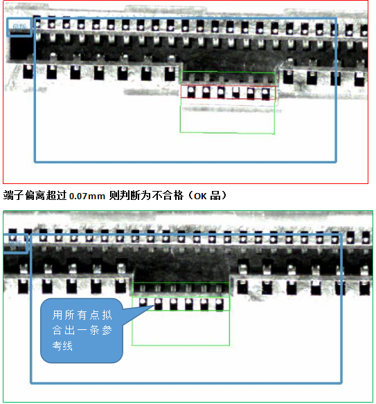 一般情況下接線端子為整體排列,有的排列成一條直線,如果其中一個或多個偏離直線(可以是端子本身基準線,也可以是設定的基準線),則系統(tǒng)會計算每個端子到基準直線的距離。當某個端子超過設定的距離范圍時,系統(tǒng)會報NG。畫面上能夠看到那個端子有問題。