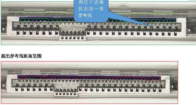 端子排列成一條直線,其中一個或多個,偏離端子直線,或偏離某一參考直線,系統(tǒng)會計算該端子偏離位置大小,如果超過設定距離,則系統(tǒng)報警。下面的例子是計算端子到邊緣直線的距離,超過設定的最小距離和最大距離時,認為端子偏離。