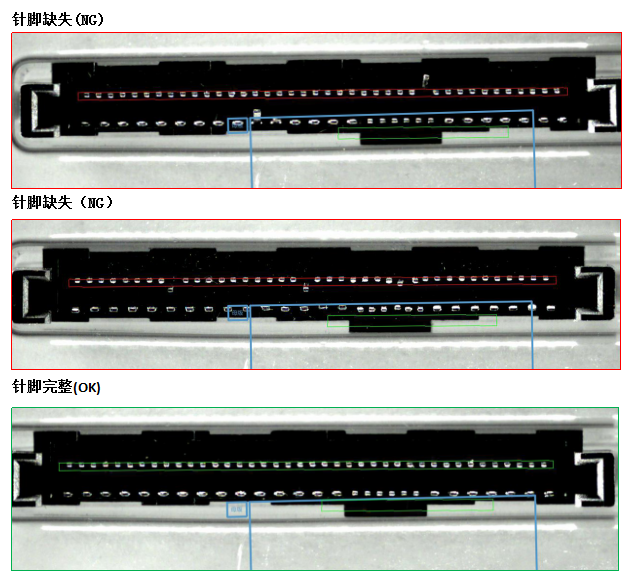 采用低角度光源,照亮每個插針的針腳,采用塊計數(shù)的方式,可以找到每個針,如果些位置針缺失,則數(shù)量會少。采用此方法可以檢測連接器針腳完整情況。