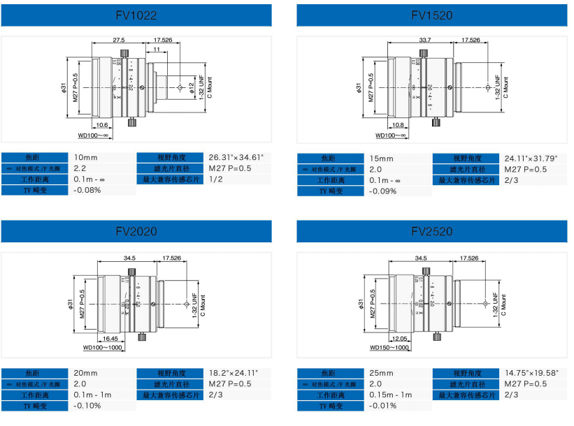 4.TV畸變現(xiàn)象小于0.1%(除了F4mm)