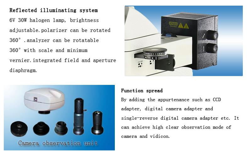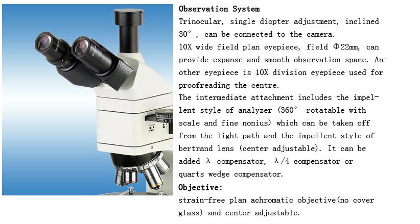 transmitted & reflected polarizing microscope is utilized polarizing light to observe and research the matter which have double refraction features, the user can make single polarizing observation, orthogonal observation, conoscope observation. It is applied in geology, chemicals, physic and medical fields, widely used to observe the crystal of liquid macromolecule polymer, biomedical polymer and liquid crystal. It is the ideal instrument for scientific research and universities teaching demo.