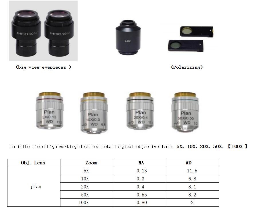 5X: WD 11.5mm 10X: WD 6.8mm 20X: WD 8.1mm 50X: WD 8.2mm 100X: WD 2mm(optional) |